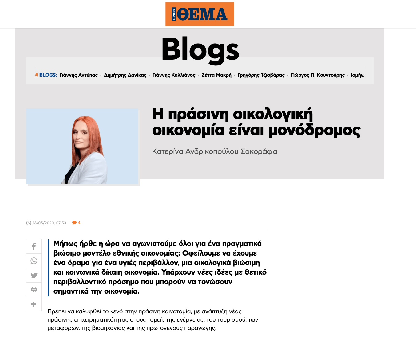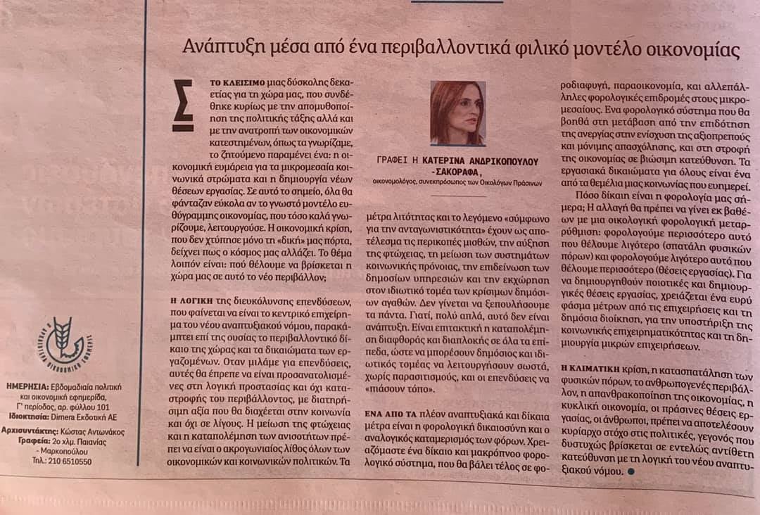 αρθρογραφεί και δηλώνει παρουσία στα έντυπα και ηλεκτρονικά μέσα ενημέρωσης προβάλλοντας το όραμα, τις αξίες αλλά και το πλάνο των Οικολόγων ΠΡΑΣΙΝΩΝ για την «επόμενη μέρα».